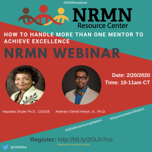 The National Research Mentoring Network’s Career Development Webinar Series surrounding mentorship and its various nuances when practicing. We have expert panelists Drs. Antenor Hinton & Haysetta Shuler.